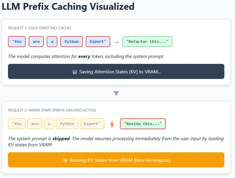 Think of a coding assistant with a fixed system instruction like “You are an expert Python code reviewer.” This instruction appears in every request. When the model processes it once, the attention relationships (keys and values) between its tokens are stored. For future requests, the model can reuse these stored KV states and only compute attention for the new user input, such as the actual code snippet.