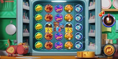 The base game operates on a five-reel layout set inside an animated fridge. Special features include two types of expanding wild symbols: