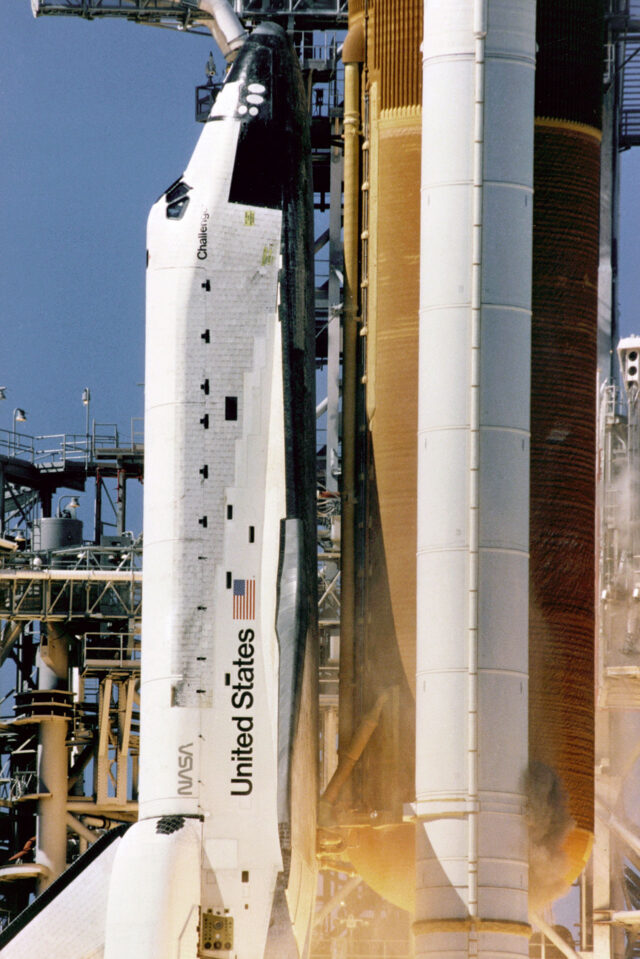 Close-up view of the liftoff of the space shuttle Challenger on its ill-fated last mission, STS-51L. A cloud of grey-brown smoke can be seen on the right side of the solid rocket booster on a line directly across from the letter “U” in United States. This was the first visible sign that an SRB joint breach may have occurred, leading to the external tank (ET-26) being compromised during its ascent. Credit: NASA