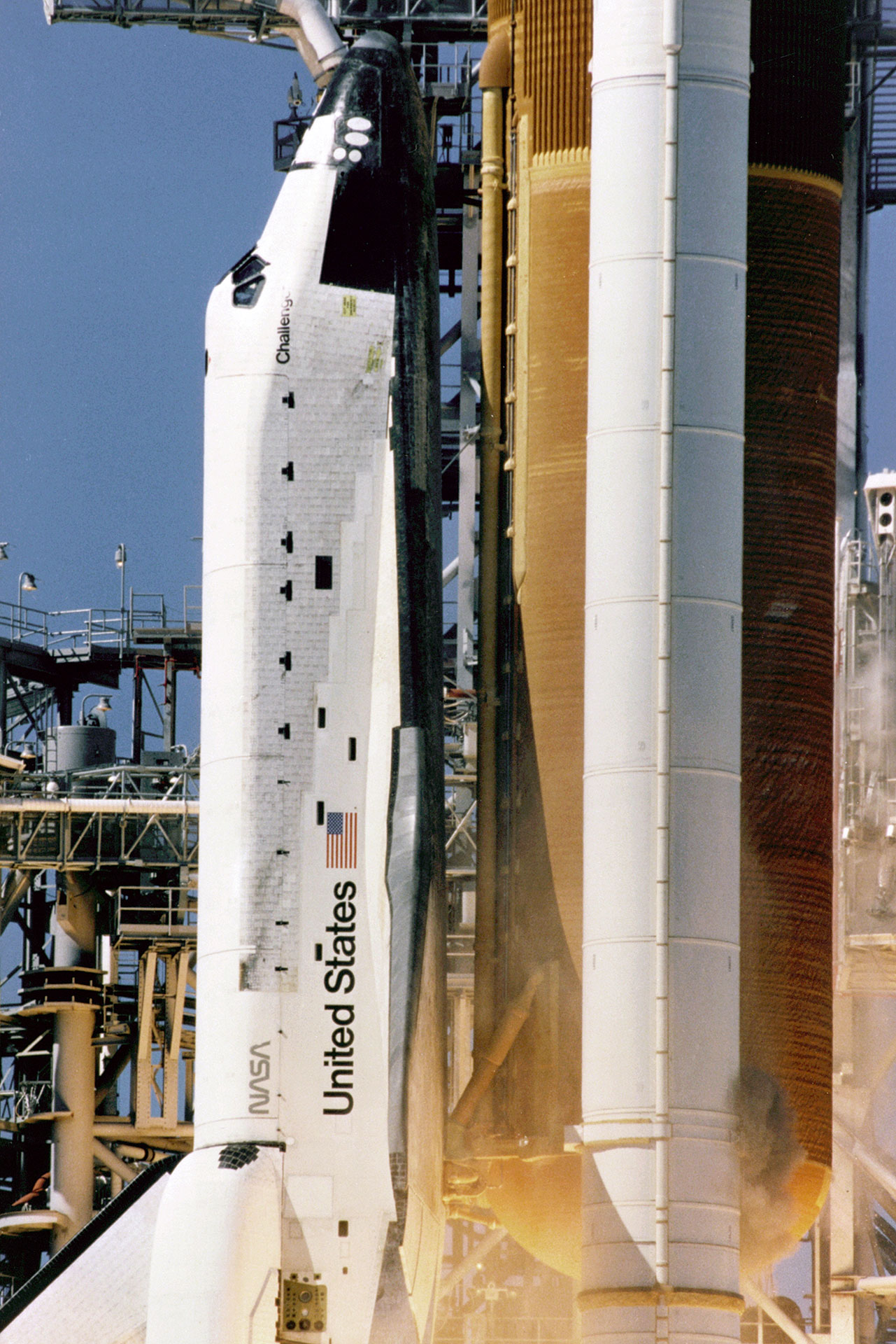 Close-up view of the liftoff of the space shuttle Challenger on its ill-fated last mission, STS-51L. A cloud of grey-brown smoke can be seen on the right side of the solid rocket booster on a line directly across from the letter “U” in United States. This was the first visible sign that an SRB joint breach may have occurred, leading to the external tank (ET-26) being compromised during its ascent.