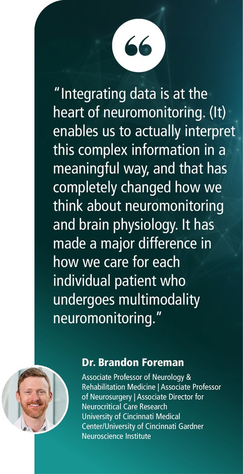 “Integrating data is at the heart of neuromonitoring,” said Dr. Brandon Foreman, Associate Director of Neurocritical Care Research at the University of Cincinnati Medical Center. “(It) enables us to actually interpret this complex information in a meaningful way, and that has completely changed how we think about neuromonitoring and brain physiology. It has made a major difference in how we care for each individual patient who undergoes multimodality neuromonitoring.”
