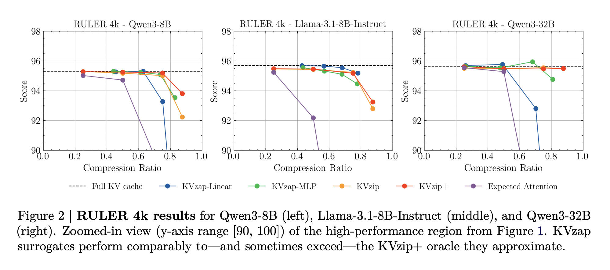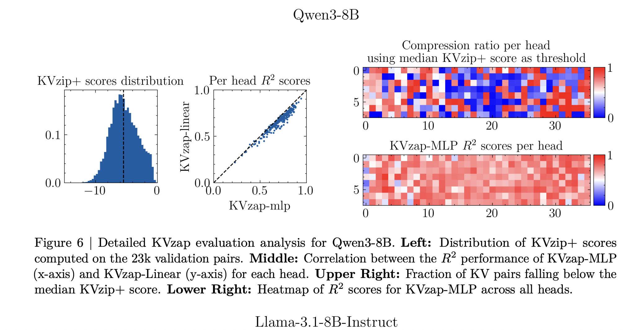 Training uses prompts from the Nemotron Pretraining Dataset sample. The research team filter 27k prompts to lengths between 750 and 1,250 tokens, sample up to 500 prompts per subset, and then sample 500 token positions per prompt. For each key value head they obtain about 1.2 million training pairs and a validation set of 23k pairs. The surrogate learns to regress from the hidden state to the log KVzip+ score. Across models, the squared Pearson correlation between predictions and oracle scores reaches between about 0.63 and 0.77, with the MLP variant consistently outperforming the linear variant.
