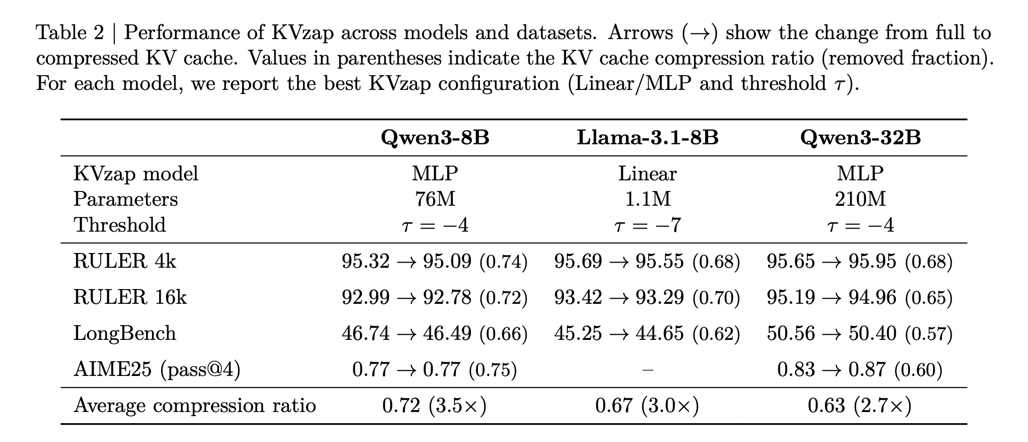 Overall, the above Table shows that the best KVzap configuration per model delivers average cache compression between roughly 2.7 and 3.5 while keeping task scores very close to the full cache baseline across RULER, LongBench and AIME25.